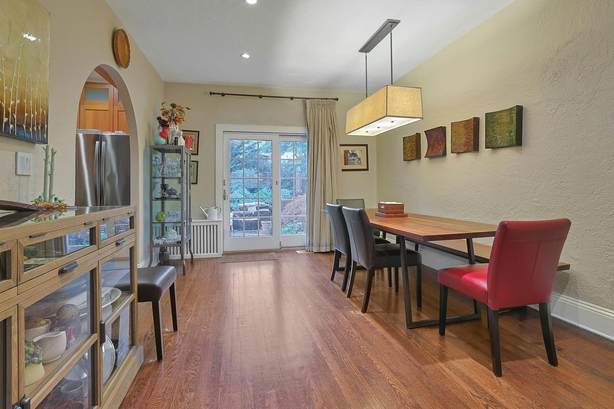 Standout features include: an entry hall with 2 coat closets; living room with wood-burning fireplace; formal dining room with sliding glass door out to the patio and garden; updated kitchen with polished granite countertops, a peninsula breakfast bar and stainless-steel appliances; main-floor guest/maid’s room with door to the yard.