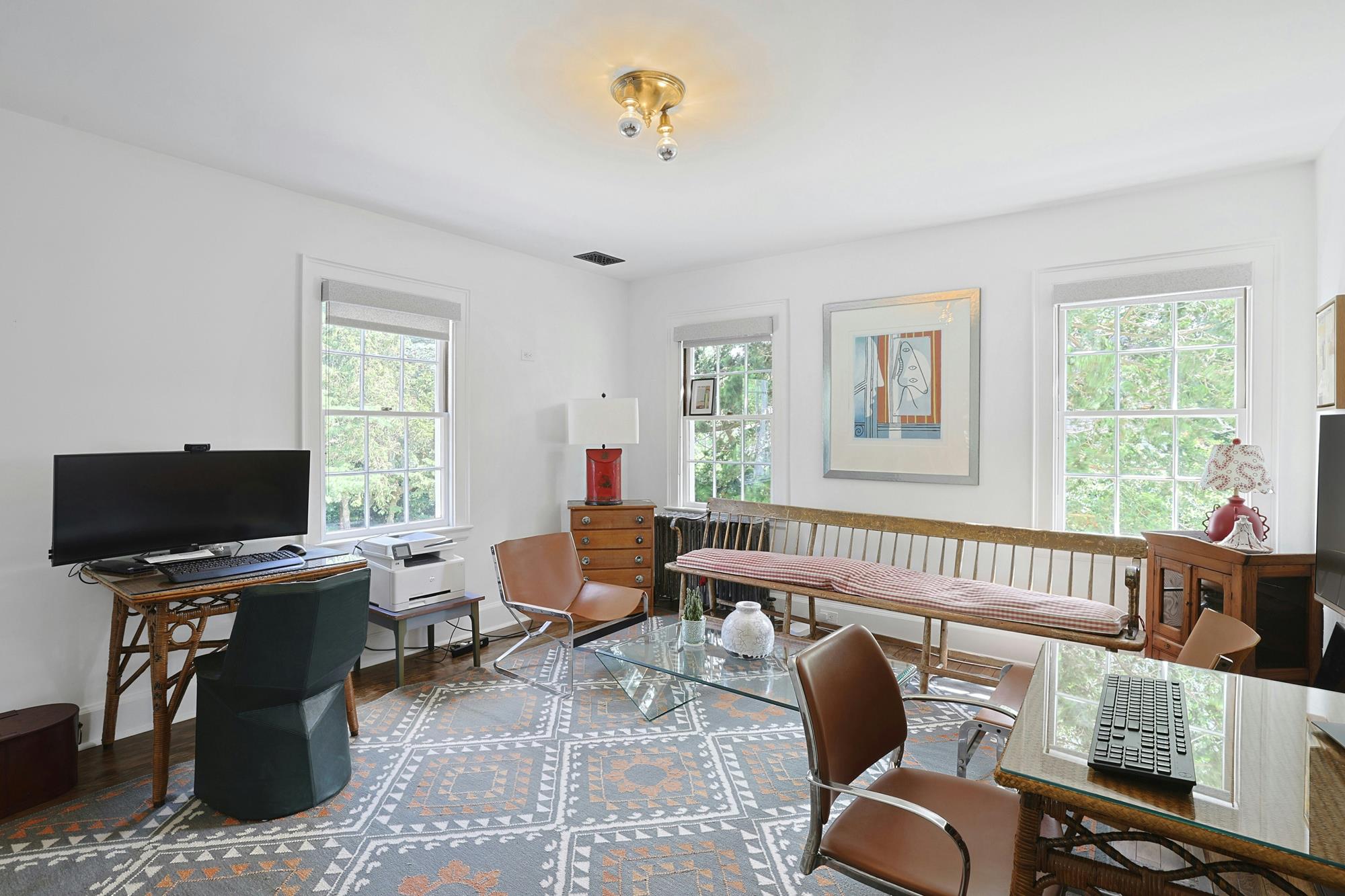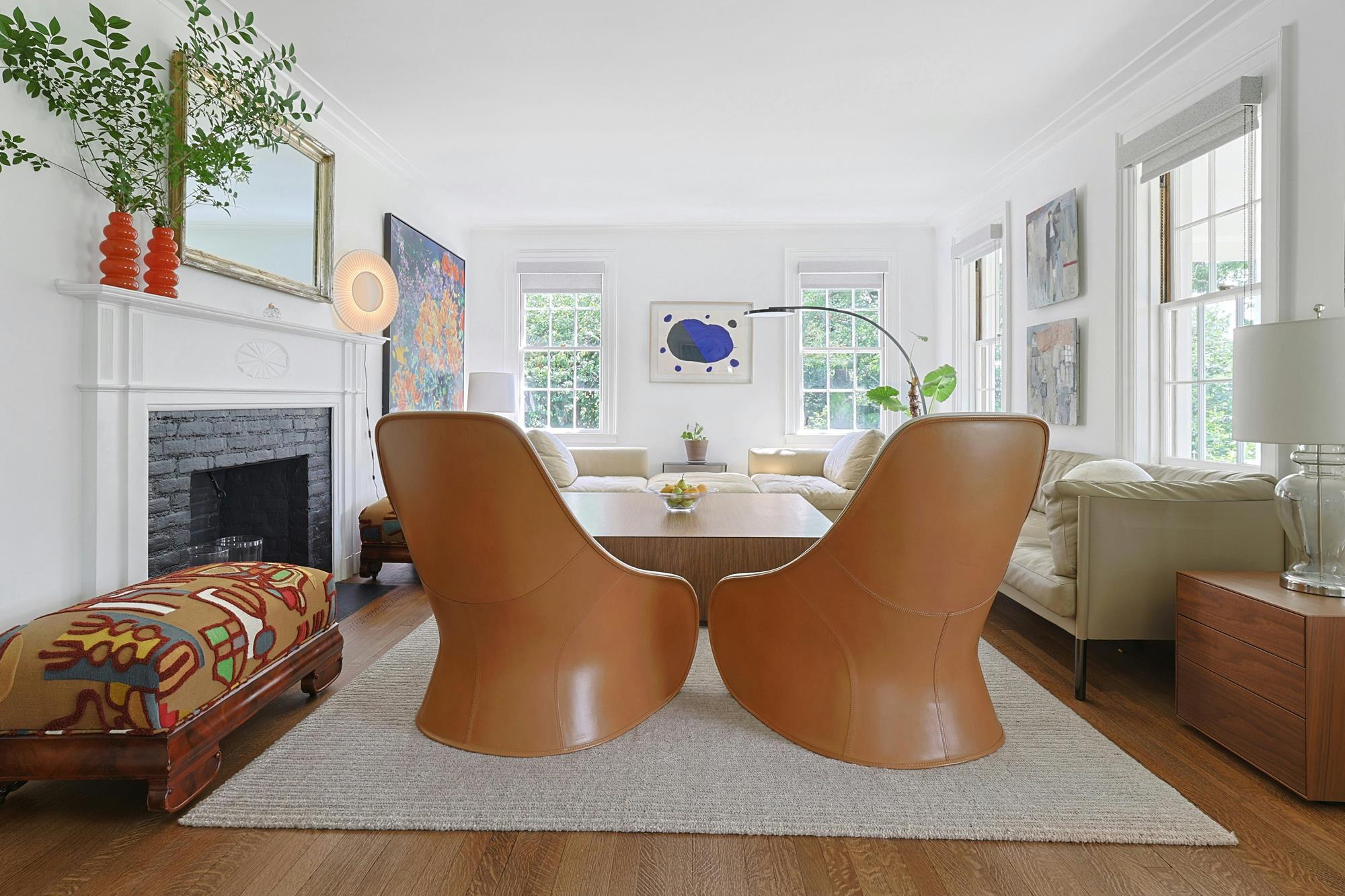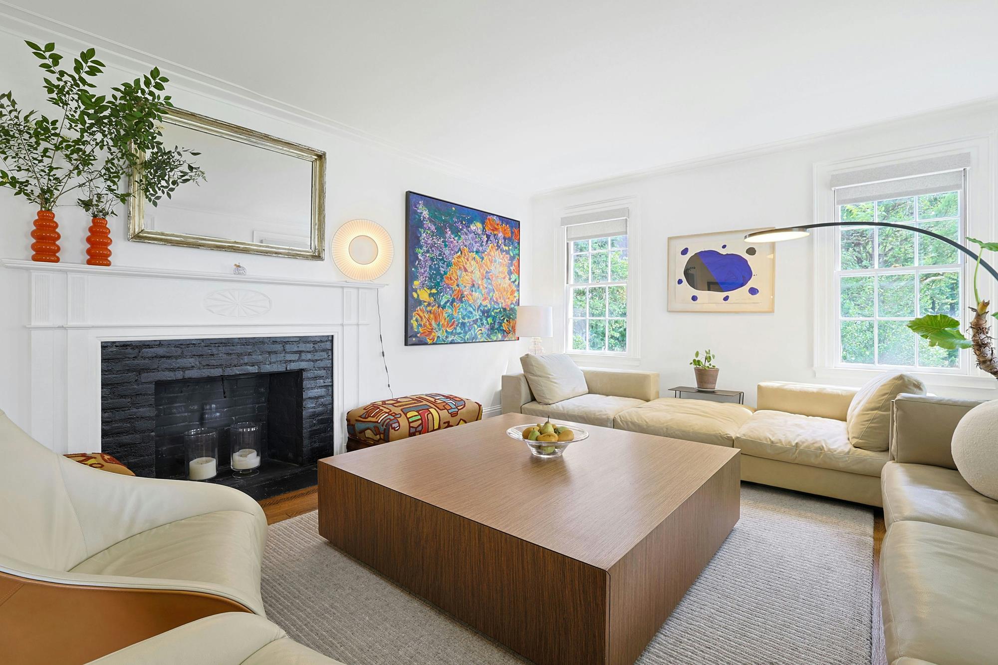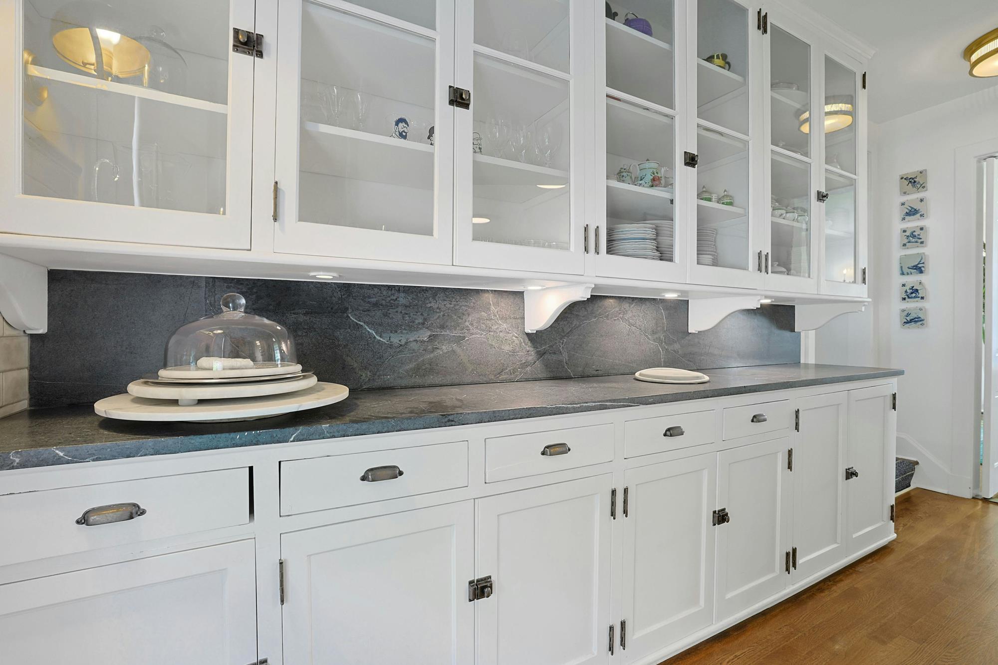 Standout features include: an entry portico; welcoming center hall; front parlor with fireplace; living room with fireplace and French door out to the back porch; formal dining room with fireplace and bay windows; renovated eat-in kitchen outfitted with soapstone sink and countertops and stainless-steel appliances (Thermador refrigerator and dishwasher, Gaggenau steam oven and warming drawer, and a Blue Star 6-burner stove); spacious walk-through butler’s pantry with custom glass-fronted cabinetry and an 11-ft.-long soapstone countertop; new main-floor powder room; master bedroom with river view; finished attic with family room and office/playroom; full unfinished basement with 2 storage rooms and laundry area; 4-zone central air-conditioning; tankless hot-water heater; 1-car attached garage (with a river view!) and an outdoor EV charger; approximately 0.49-acre lot.